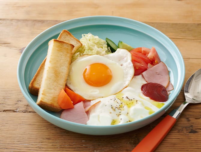 ハムエッグヨーグルトは、そのまま食べてもおいしいですが、かき混ぜてから食べるのもおすすめです。これ一品で「炭水化物」「たんぱく質」「ビタミン」がバランスよく摂れます。ケチャップを加えたヨーグルトはそのままはもちろん、卵や野菜との相性も抜群です。