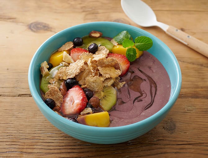 アサイーヨーグルトボウルは冷凍のアサイーピューレを使っているので忙しい朝でも手軽に作ることができます。アサイーはポリフェノールや鉄分などの栄養素が多く含まれている「スーパーフード」。はちみつをかけて甘くしたり、シリアルを入れて食感を楽しんだりとアレンジを楽しめる一品です。
