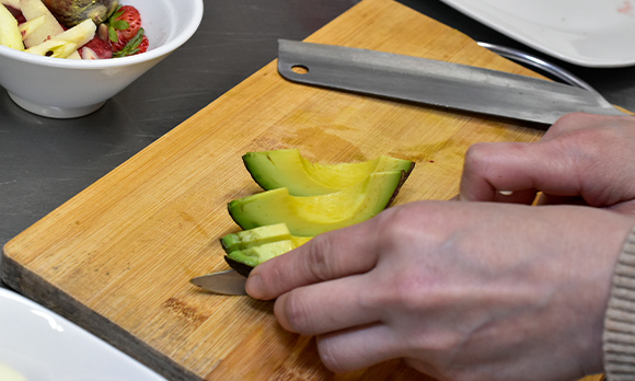 アボカドとりんごは皮をむき、お好みの大きさに、いちごとぶどうは半分に切る。