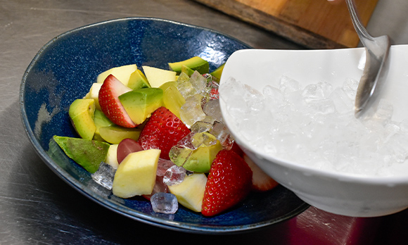 深さがある器に1のフルーツを入れて、その上に砕いた氷をのせる。