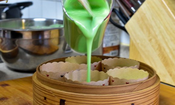 パンダンリーフケーキは、東南アジアではポピュラーなお菓子で、伝統的レシピではココナッツミルクを使いますが、今回はプレーンヨーグルトで作りました。コクが出てしっとりした食感になります。蒸し器で作る伝統的な方法のほか、オーブンで焼く方法も一緒にお伝えしますね。表面が香ばしく仕上がります。