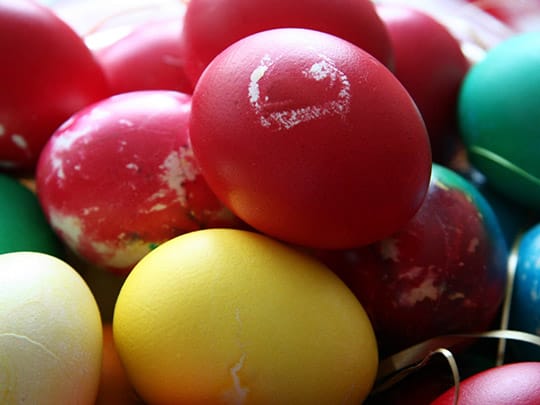 卵からヒナが生まれる様子とキリストの復活が結び付けられたことと、冬が終わり草木に再び生命が甦る喜びを表現するために卵が用いられ、ウサギは多産で生命の象徴とされているそうです。毎年ヴェリクデンにはイースターエッグを作ります。イースターエッグの作り方はとても簡単。ゆでた卵を食紅と酢を混ぜた熱湯に入れ、好みの色に染まったら乾かして出来上がりです。