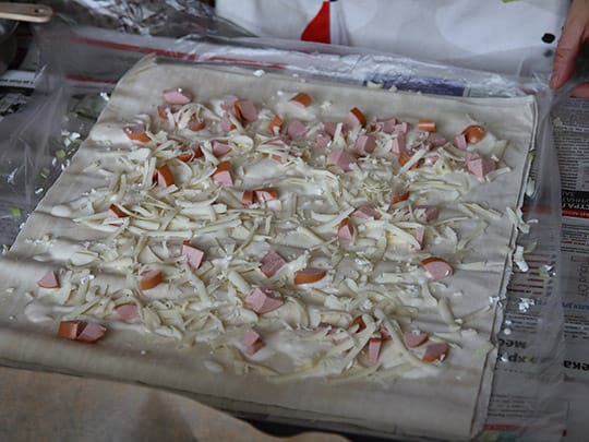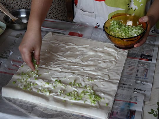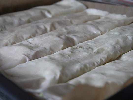 我が家では特に長ネギとシレネーのバニッツァと、ソーセージとカシカヴァルのバニッツァが人気です。作り方は至って簡単。ヨーグルト350gに卵を一つ割り入れ混ぜ、生地に薄くオイルを塗って先のヨーグルト液をポタポタとたらし、ネギやシレネー、ソーセージにカシカヴァルなど好きなものを並べ、クルクルと巻きます。天板に並べて卵液を塗り、約230℃のオーブンで20分程焼いたら出来上がりです。