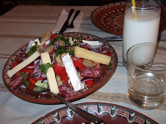 中に暖かい暖炉やペチカ(薪ストーブ)があり、寒い日に赤々と火が燃えているのを見ると心が和みます。席に着いたらまずは飲み物から注文します。ラキア(ブドウなどの果実から作られるアルコール度の高い蒸留酒)が定番でしょう。チェーサーには、これまたブルガリアの定番のヨーグルトドリンク「アイリャン」を一緒にオーダーします。おつまみのことをブルガリア語で「メゼ」と言いますが、これにはチーズやサラミの盛り合わせ、レバーや牛タンのオイル煮、さらに具沢山のサラダがおすすめです。そしてラキアでおなかを温め、つまみを食べながらブルガリア伝統料理のメインディッシュを待ちます。