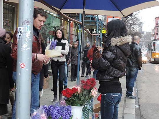 そんな3月初め、大きなバス停やパザールにはもちろん、いろいろなところに花束を売る売店が出来ます。なぜなら3月8日の「国際女性デー」は女性にお花を贈る習慣があるからです。日本ではいまひとつメジャーではありませんが、これは国連が決めた日だそうで、旧ソ連では大々的に祝われていたとか。その影響を強く受けたブルガリアでも結構盛大に行われているように見えます。