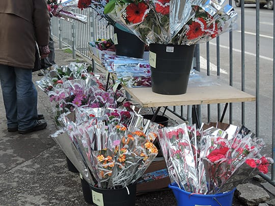 早春にうれしいヒヤシンスや水仙、またスイートピーやフリージア、バラ、ガーベラ、チューリップ、カーネーションなどブーケの定番がいっぱい。一番小さな花束は1レバ(約70円)くらいから売られています。ブルガリアの女性はお花が大好きなので、贈られなくても自分用に家に飾ろうと買って帰る人たちもたくさんいます。
