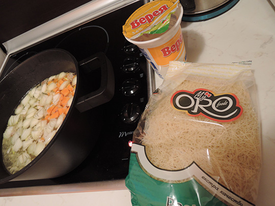 でもそんな中、どこの食堂でも、またどこの家庭でも人気なのが「鶏のスープ」というそのままのネーミングの「ピレシュカ・スパ」です。骨付き鶏肉が手に入ったら作りたくなるスープで、一緒にニンジンや玉ねぎなどの野菜を煮るのですが、忘れてならない具の一つがフィデです。これはバミセリのような細いパスタを砕いたもので、入れると少しとろみがついて腹持ちが良くなります。そして、このスープの味の決め手となるのが卵とヨーグルトです。二人分ではヨーグルト大さじ3と卵1コを仕上げに入れるのですが、この入れ方が独特で、まず鍋の火を消し、ヨーグルトと卵を混ぜ合わせたものに少しスープを加えながら、泡立て器で丁寧に分離しないように混ぜ、よく混ざったら鍋に投入して出来上がりです。なので、このピレシュカ・スパは熱々ではない状態で提供されます。また、温め直すと最後に入れた卵が凝固してしまうので、たくさん作りすぎないように気を付けます。