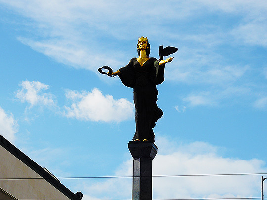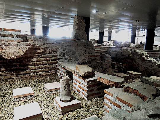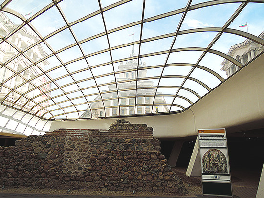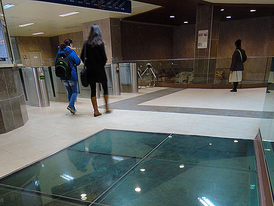 まずは、地下鉄「セルディカ」駅。駅の真横には大きな聖ソフィア像があり、これと向かい合う形で、ブルガリアの政治の中心「ナロドノ・サブラニエ」(国会。旧共産党本部)が建っています。この間の地下道はきれいに整備され、発掘された石碑や遺跡が手に触れられるところにあり歴史を感じさせる一方、ガラスで覆われた天井は明るく現代的な印象を与えます。しかも、以前は交通量の多さと乱暴な運転のため命がけで渡っていた横断歩道も渡らずに済みますし、地下鉄駅から雨の日にも濡れずに行けるのでとても便利です。