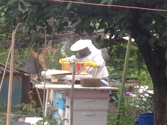 養蜂を生業としてはいなくても、自分の庭にいくつか巣箱を置いて、自分の家で使う分くらいの蜂蜜を集めている人たちも結構います。そんなご近所さんに写真を撮らせてもらいました。宇宙服のような防護服に手袋、ポフポフと煙の出る缶を手に、巣箱から巣枠を引き出していきます。それから1か月くらいしてこのご近所さんからその時のおすそ分けをいただきました。さわやかな甘さで、この近所の花から集められた蜜と考えるととても興味深いです。これがもし自分の飼うミツバチたちから採取したものだったら、「手前味噌」ならぬ「手前蜂蜜」⁉ ご近所や職場でおすそ分けしたらちょっとかっこいいかも。