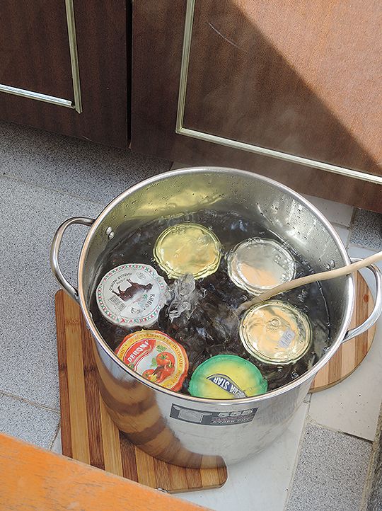 電熱線で直接お湯を沸かせる道具、「ブルゾヴァル」を使用して、砂糖・果物を詰めた瓶を温め煮つめます。