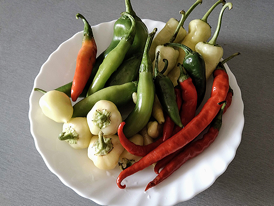 いろいろな種類の唐辛子。一番大きい緑色のものは、一つだけピーマン。