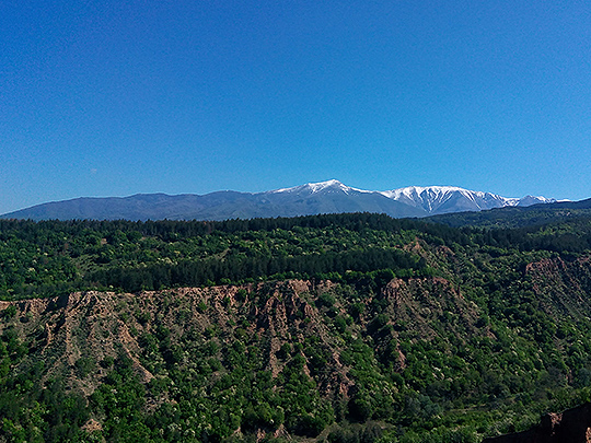 遠くに見える雪がある山は、リラ山脈