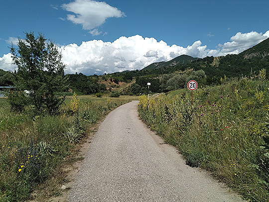 目の前に見えている山に登るための道。途中でアスファルトは消えるが、速度規制の標識があることに驚いた