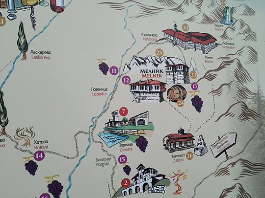 ブルガリアの国の大部分の地域は大陸性気候ですが、ギリシャとの国境付近にある南部は地中海性気候に属します。そのため、ブルガリア国内のほかの地域とは少し異なる植物などを見ることができます。今回訪れたメルニック(Мелник・melnik)という町も地中海性気候で、赤ワインが有名です。メルニックの周辺にはぶどう畑が広がり、多くの場所で赤ワインが売られています。
