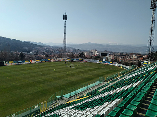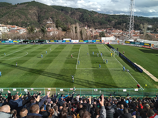 ブルガリアで一番メジャーなスポーツといえばサッカーです。毎日のようにヨーロッパ中のサッカーの試合がブルガリアのテレビで放映されるため、家庭でよく観られている印象があります。ブルガリア国内のプロサッカーリーグは2部制で、私が住んでいるブラゴエフグラッドには、1部リーグに所属している「ピリン」(ФК Пирин,FC Pirin)というサッカーチームがあります。1922年に設立され、今年の6月にちょうど100周年を迎えます。今年から2名の日本人選手がピリンに所属したと知り、興味が湧いたのでさっそくサッカー観戦に行ってみました。