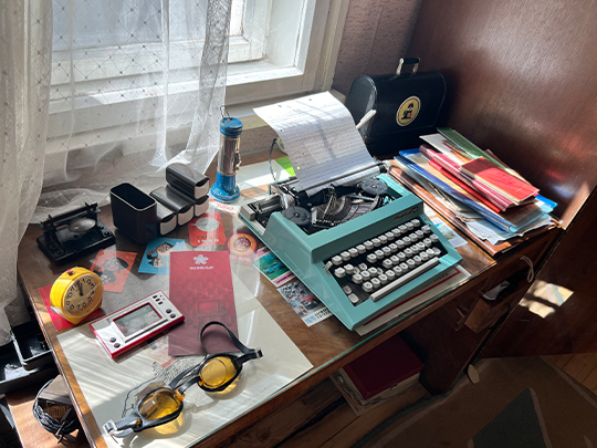 子ども部屋の勉強机。タイプライターがおいてあり、キリル文字を実際にうつことができる