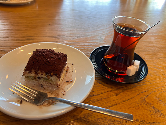 カルジャリにあるトルコスイーツ店では、ほかのブルガリアの地域ではなかなか出合えないスイーツが並びます。冷やした「バクラヴァ(フィロ生地の間にピスタチオ等を挟んで焼いたトルコの伝統菓子)」というスイーツをトルコ茶と一緒にいただきました。5月に紹介したバクラヴァとは違い、ミルクシロップが掛かっていてアイスのように冷たくなっており、通常のものよりも甘さが控えめに感じるのでとてもおいしかったです。