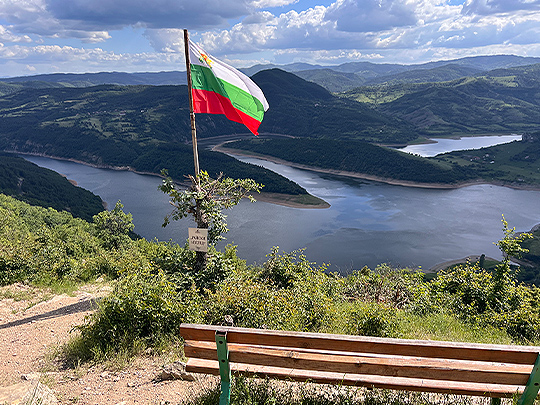 そしてさらにこの街から車で30分ほどロドピ山脈を西に進み、そこから1時間以上かけて、「パラダイスビュー」(Райски изглед, Rayski izgled)と呼ばれる場所へ。とても美しい景色が望めるポイントまで徒歩で登りました。アルダ川の曲がりくねった様子、ボロヴィッツァ川が合流し、その川がダムまで続いている様子などを上から望むことができました。登っている間は曇っていましたが、到着した時にちょうど雲から太陽が顔を出し、映える写真が撮れました。道が急こう配のため滑る危険性があり、杖を使った方がいいのかもしれません。遊歩道の始点には、杖にちょうどいい木の棒が茂みにさしてあったり、道端に置いてあったりしました。「ご自由にお使いください」とは書いてありませんでしたが、ハイキングの助けとなる1メートル以上の長さの杖が無造作に何本も置いてあるのは不思議な光景でした。道の途中で友人たちは、オレンジ色のきのこを収集したりしてハイキングを楽しみました。