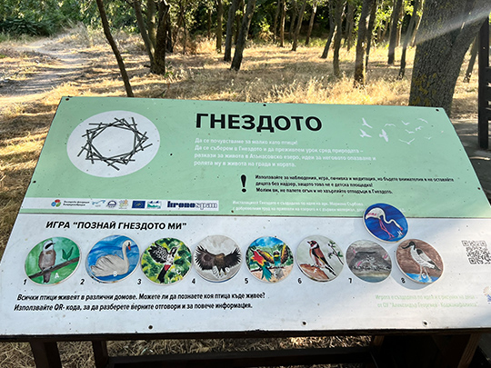 湖の北西部、市街地側にはバードウォッチングスポットがあります。野生の鳥なので、双眼鏡がないとフラミンゴをはっきり見るのは難しいですが、遠くに薄いピンク色の大きな鳥が多数湖にいるのを観察できました。この地域に生息する野生の鳥を紹介する看板には、それぞれの鳥のイラストが描かれ、しかもマグネット形式になっています。マグネットをずらすと、その鳥の巣のイラストが出現。凝った仕組みになっていて面白かったです。
