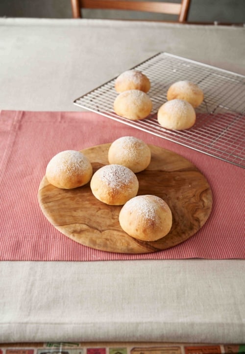 6. 5をまな板の上に取りだし、打ち粉(分量外)をして四角くのばし、8等分にして丸める。