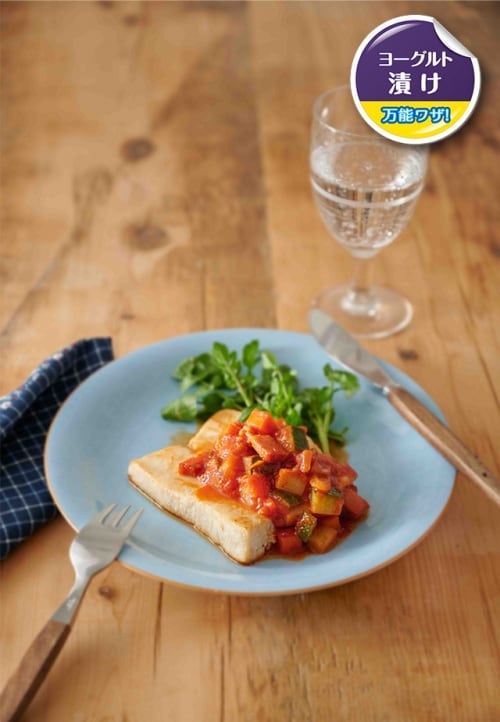 ヨーグルトに漬け込んだかじきは、魚臭さが無く、しっとりやわらか食感。ソースの仕上げにヨーグルトを加えることで、コク・深みがあるのにさっぱりとした味わいになります。
