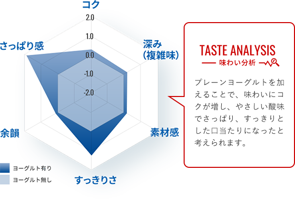 プレーンヨーグルトを加えることで、素材の美味しさはそのままに、コクが増してヨーグルトのやさしいな酸味でさっぱり、すっきりとした口当たりに。また、加熱による豚肉の脂肪臭が軽減されました。