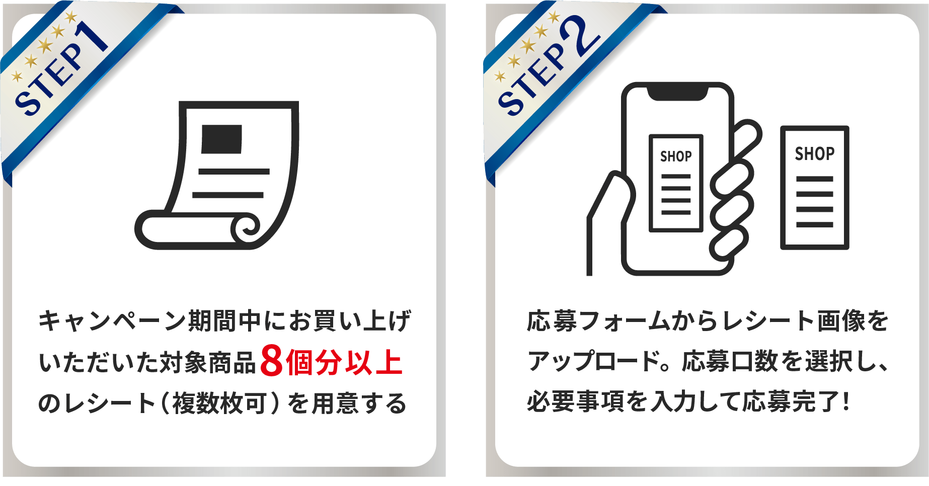 キャンペーン期間中にお買い上げいただいた対象商品8個以上を含むレシート、またはネットスーパー(スーパー業態店舗からの宅配)やCOOP共同購入の納品書兼領収書(複数枚可)でご応募いただけます。