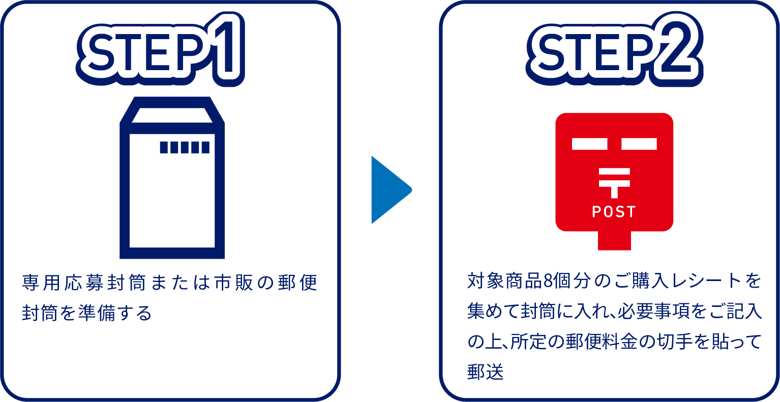 キャンペーン期間中にお買い上げいただいた対象商品8個分のレシート(複数枚可)を1口として専用応募封筒または市販の封筒に入れ、必要事項(郵便番号、住所、氏名(フリガナ)、電話番号)を明記の上、ご応募ください。