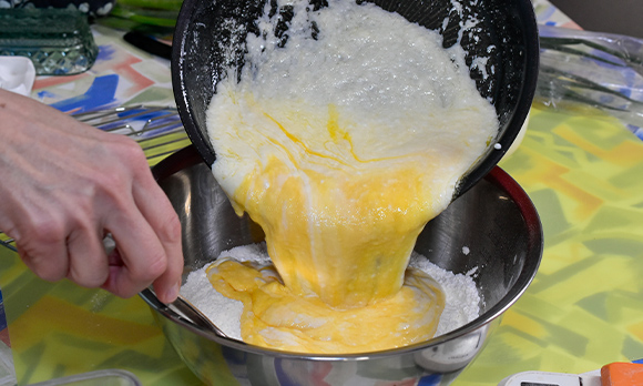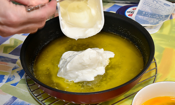 生地の準備をする。フライパンにバターを入れて弱火~中火で熱し、焦がさないように溶かしバターを作る。火からおろし、砂糖、塩、ヨーグルトを入れて混ぜ、溶き卵を加えてさらに混ぜる。
