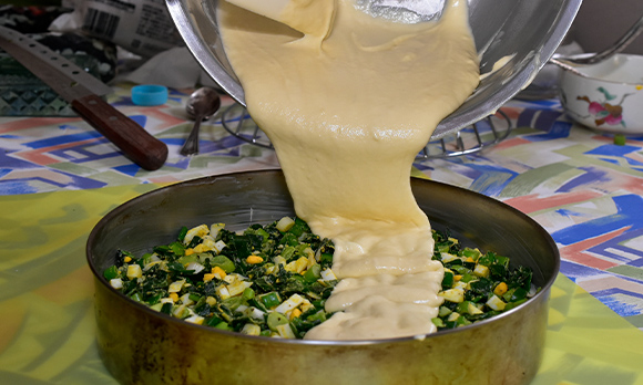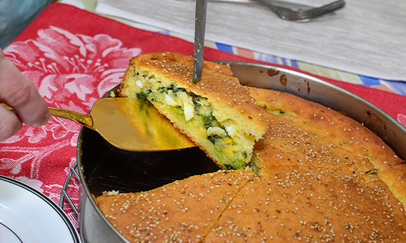 見た目も華やかでありながら手軽に作れる、ボリュームのある家庭料理です。ヨーグルトを使った生地に、青ねぎとゆで卵の具材が詰まっています。ロシアでは、このような生地は発酵乳の一種であるケフィアで作ることが多いですが、ヨーグルトで作ると、よりふんわりとした仕上がりになります。通常は「ポロネギ」と呼ばれる西洋ねぎを使いますが、今回は日本で手に入りやすい青ねぎを使いました。ロシア中部の寒冷な地域ではイーストを使った生地のパイが一般的ですが、アストラハンではベーキングソーダ(重曹)を使った、より軽いタイプのパイが好まれています。
