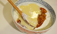 ボウルに1、コンデンスミルク、ママレード、ブルベリージャム、ミックスベリージャムを入れ、混ぜる。