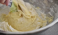 4に小麦粉、重曹をふるいながら3回に分けて入れ、ヘラでよく混ぜる。