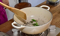鍋に植物油を入れて中火で熱し、マスタードシードを加え、パチパチと音がしてきたらカレーリーフを入れ、油がなじむまで炒める(ドライのカレーリーフを使う場合は、後ほどBのスパイス類と一緒に入れる)。