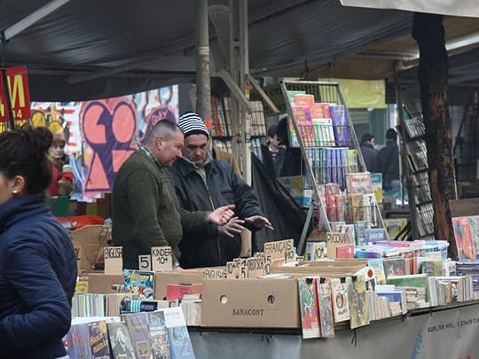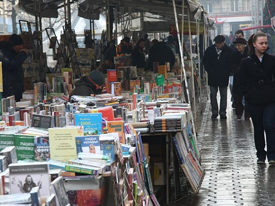 古本屋が立ち並ぶソフィアのスラヴェイコフ広場。ソフィアのセンターに位置し、待ち合わせ場所にもよく利用されます。広場の名前に由来するのは作家のペトコ・スラヴェイコフとペンチョ・スラヴェイコフ。この父子の像が並んで座っているベンチもあり、隣に腰をかけて記念撮影をする光景もよく見られます。