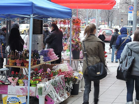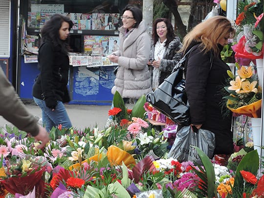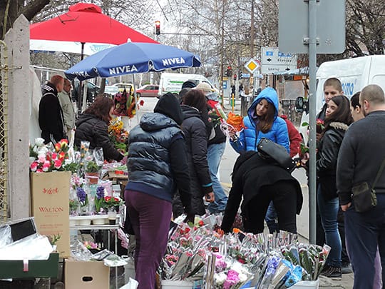 そんな3月初め、大きなバス停やパザールにはもちろん、いろいろなところに花束を売る売店が出来ます。なぜなら3月8日の「国際女性デー」は女性にお花を贈る習慣があるからです。日本ではいまひとつメジャーではありませんが、これは国連が決めた日だそうで、旧ソ連では大々的に祝われていたとか。その影響を強く受けたブルガリアでも結構盛大に行われているように見えます。
