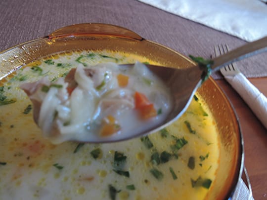 でもそんな中、どこの食堂でも、またどこの家庭でも人気なのが「鶏のスープ」というそのままのネーミングの「ピレシュカ・スパ」です。骨付き鶏肉が手に入ったら作りたくなるスープで、一緒にニンジンや玉ねぎなどの野菜を煮るのですが、忘れてならない具の一つがフィデです。これはバミセリのような細いパスタを砕いたもので、入れると少しとろみがついて腹持ちが良くなります。そして、このスープの味の決め手となるのが卵とヨーグルトです。二人分ではヨーグルト大さじ3と卵1コを仕上げに入れるのですが、この入れ方が独特で、まず鍋の火を消し、ヨーグルトと卵を混ぜ合わせたものに少しスープを加えながら、泡立て器で丁寧に分離しないように混ぜ、よく混ざったら鍋に投入して出来上がりです。なので、このピレシュカ・スパは熱々ではない状態で提供されます。また、温め直すと最後に入れた卵が凝固してしまうので、たくさん作りすぎないように気を付けます。