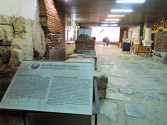 まずは、地下鉄「セルディカ」駅。駅の真横には大きな聖ソフィア像があり、これと向かい合う形で、ブルガリアの政治の中心「ナロドノ・サブラニエ」(国会。旧共産党本部)が建っています。この間の地下道はきれいに整備され、発掘された石碑や遺跡が手に触れられるところにあり歴史を感じさせる一方、ガラスで覆われた天井は明るく現代的な印象を与えます。しかも、以前は交通量の多さと乱暴な運転のため命がけで渡っていた横断歩道も渡らずに済みますし、地下鉄駅から雨の日にも濡れずに行けるのでとても便利です。