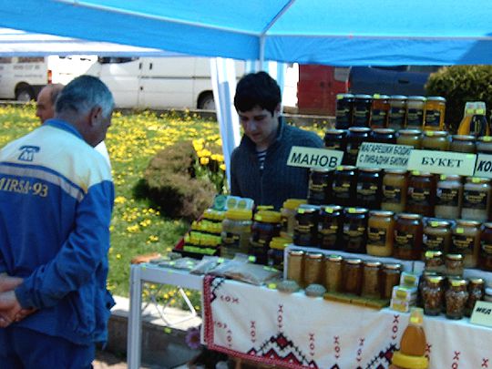 5月は夏の始まりで、ミツバチにとってはおいしい花の蜜の集め時。プラムやリンゴの花はほころび、アカシア、リンデンの木からは甘い香りが広がります。草原も小さなハーブの小さな花たちが美しく咲き誇ります。働きバチたちはまめまめしく花から花へと蜜を集めます。ブルガリアでは養蜂がとても盛んで、職業としての養蜂業者もたくさんおり、市場で自分のところで採れたいろいろな花の種類の蜂蜜を並べて販売する個人業者もたくさんいます。そしてこの時期、ソフィア中心部の「バーニャ・バシ・ジャーミヤ」の広場や、ショッピングモールのエントランスなどで蜂蜜フェアーが開催され、蜂蜜だけでなくプロポリス(ミツバチが生成する樹液状の固形物で、抗菌作用がある。)やビーポーレン(ミツバチが集めた花粉の塊で、ミツバチが分泌する酵素等も含まれている。)、蜜ろう(ミツバチが巣をつくるために分泌するもの。)など自分のところで採れた製品を宣伝しながら販売しています。