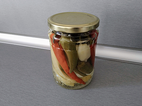 家で作った唐辛子の瓶詰。酢、砂糖、塩と水を入れてふたをする。