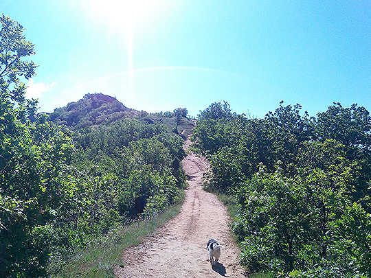 上る途中の道。私たちの散策についてきた犬と