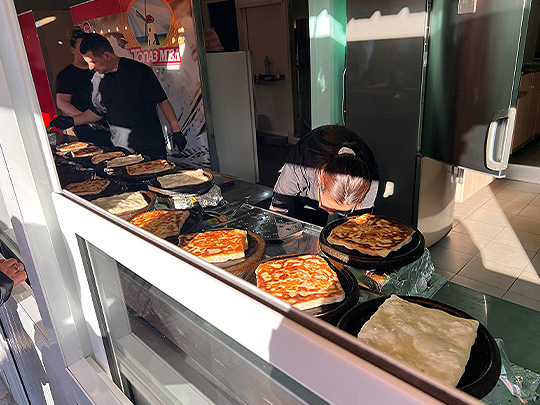 屋台もあり、食べ歩きも楽しめます。バニッツァが名物とのことで試してみました。ブルガリアのバニッツァは通常はオーブンで焼かれますが、この屋台では円形の黒い陶器の上で焼かれ、バターを使用することでいい香りが遠くまで漂っていました。表面の生地はカリカリになるまで焼かれ、中の白チーズは熱々でとてもおいしかったです。