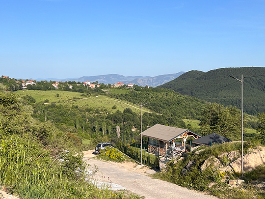 そしてさらにこの街から車で30分ほどロドピ山脈を西に進み、そこから1時間以上かけて、「パラダイスビュー」(Райски изглед, Rayski izgled)と呼ばれる場所へ。とても美しい景色が望めるポイントまで徒歩で登りました。アルダ川の曲がりくねった様子、ボロヴィッツァ川が合流し、その川がダムまで続いている様子などを上から望むことができました。登っている間は曇っていましたが、到着した時にちょうど雲から太陽が顔を出し、映える写真が撮れました。道が急こう配のため滑る危険性があり、杖を使った方がいいのかもしれません。遊歩道の始点には、杖にちょうどいい木の棒が茂みにさしてあったり、道端に置いてあったりしました。「ご自由にお使いください」とは書いてありませんでしたが、ハイキングの助けとなる1メートル以上の長さの杖が無造作に何本も置いてあるのは不思議な光景でした。道の途中で友人たちは、オレンジ色のきのこを収集したりしてハイキングを楽しみました。