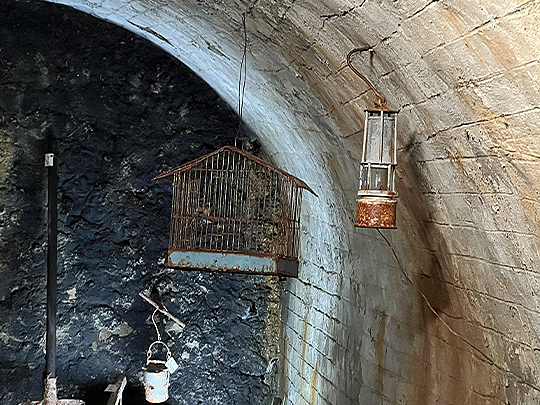 ガスを察知するためのランプと鳥をいれていた鳥かご